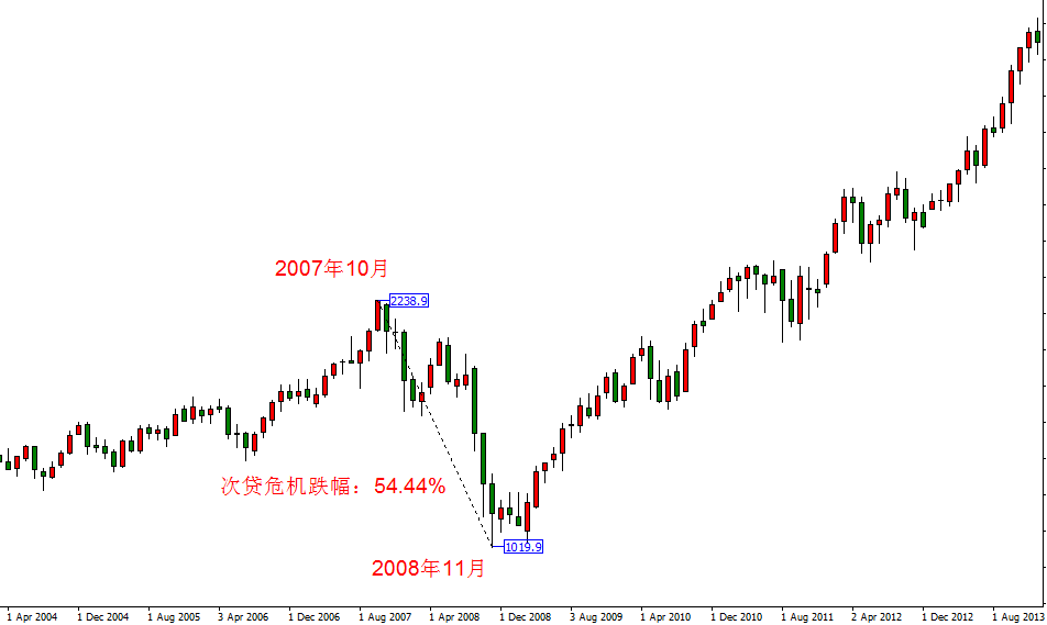 08年次贷危机期间,由于互联网类科技股没有处在漩涡中心,所以纳斯达克指数并未重演2000年互联网泡沫的空头行情。自2007年10月至2008年11也,总计13个月的时间,纳斯达克指数从2238.9跌至1019.9,跌幅54.44% 。幅度相比互联网泡沫时期下降很多,但如次贷危机一般的事件出现频率依旧较低,不能满足长期投资者的入场频率要求。50%左右的跌幅,是历次经济危机对股票市场造成冲击的平均幅度。包括中国沪深300指数在15年杠杆行情崩溃后,出现40%左右最大跌幅的情况。