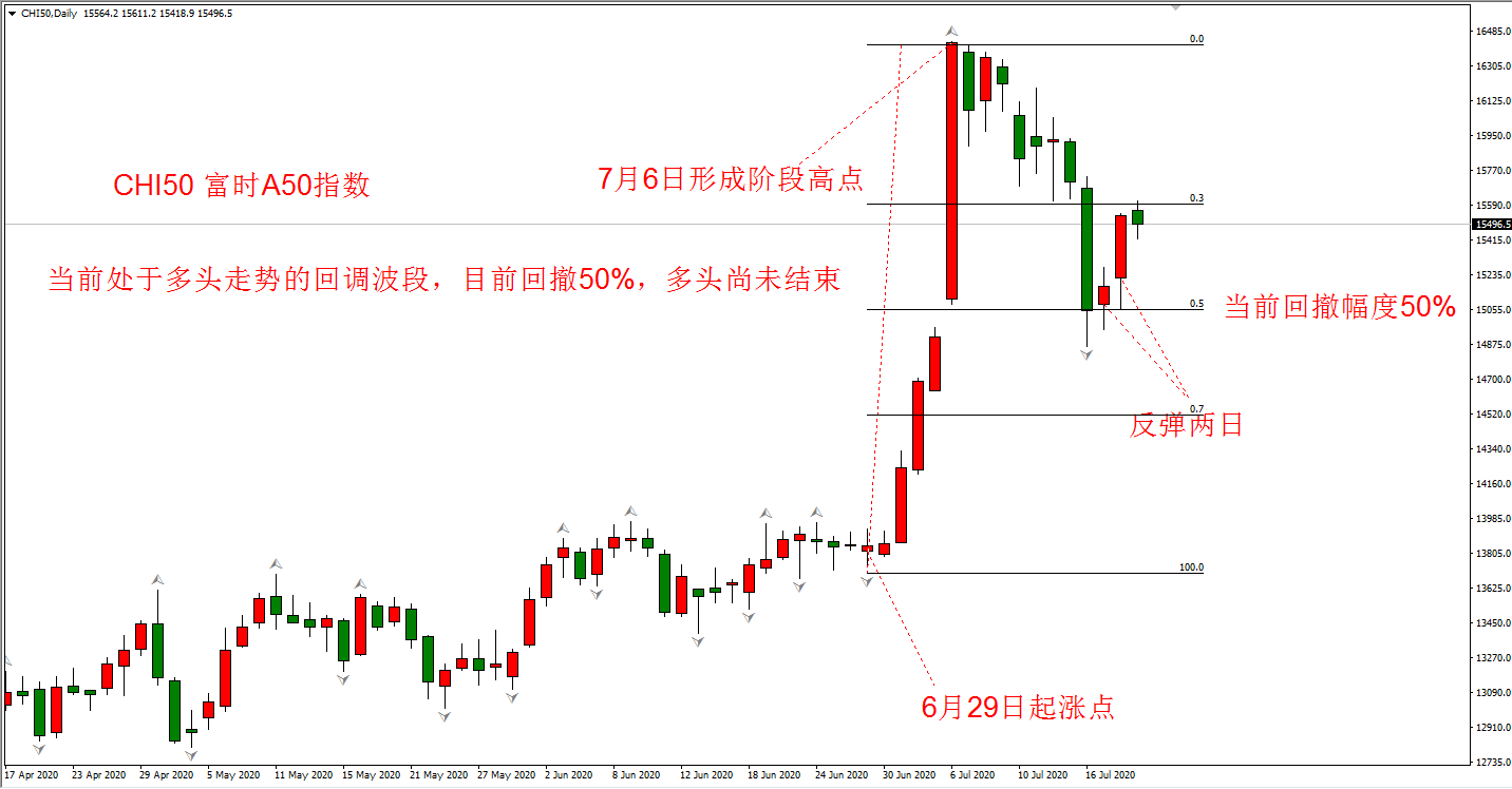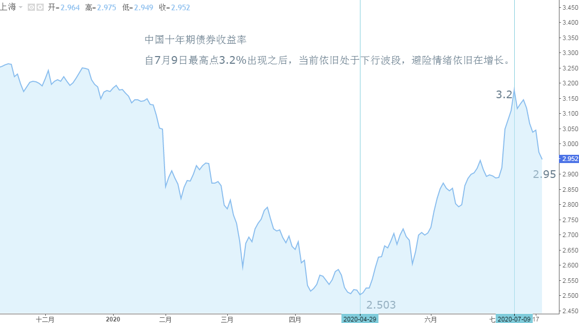 中国十年期债券收益率走势图与A股市场走势存在一定程度的共振性,背后的逻辑依据是上市公司的净资产收益率平均水平和债券长期收益率存在正相关关系。自4月29日开始,债券收益率开启上行波段,自最低点2.503%上涨至7月9日的3.2% 。之所以能够在疫情的阴霾之下保持利率上升,是因为中国对疫情的处理坚决果断,是全球典范。因此,现阶段中国经济相比海外国家存在巨大的比较优势。但是,在7月9日之后,债券收益率开始向下调整,这代表避险情绪在不断升温。之所以把本次下跌看做调整走势,是因为中国统计局公布的二季度GDP增速为正增长3.2%,超出市场预期,代表宏观经济进一步好转。
