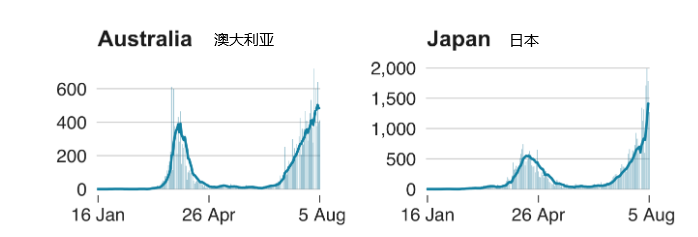 日本、澳大利亚和西班牙在前期稳定疫情一段时间后,确诊病例再次呈现飙升的趋势。其中日本的7天平均确诊病例已经远超第一次来袭情况。日本近8天病例猛增1万,并且这8天单日新增确诊病例超过200例。