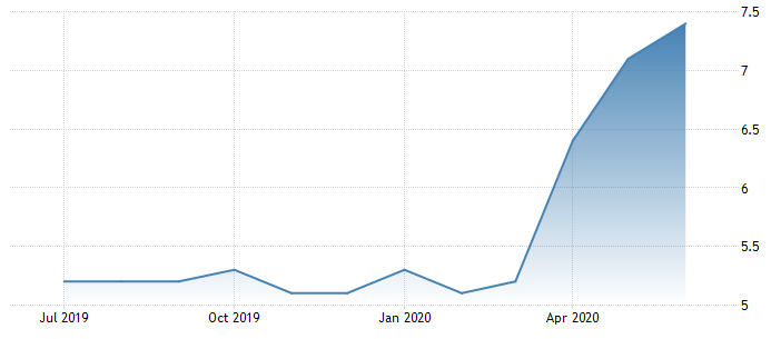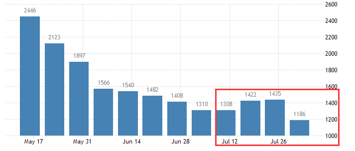 虽然由于统计主体和口径不同,但通常ADP数据与美国劳工部非农数据有一定的关联性。此外7月份由于疫情再次袭来的原因,整个7月份的初请失业金人数止住了收缩的趋势,呈现略微上涨的的态势。