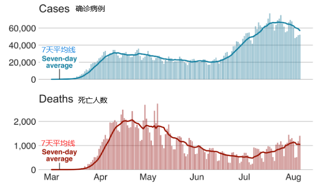 近几周来,美国出现了创纪录的新病例数,不过目前增速正在下降。6月下旬疫情再次激增的原因是南部和西部地区出现新的疫情,自5月底各州开始放松禁闭限制以来,感染率一直在上升。死亡人数将近16万,几乎是全世界冠状病毒死亡人数的四分之一。