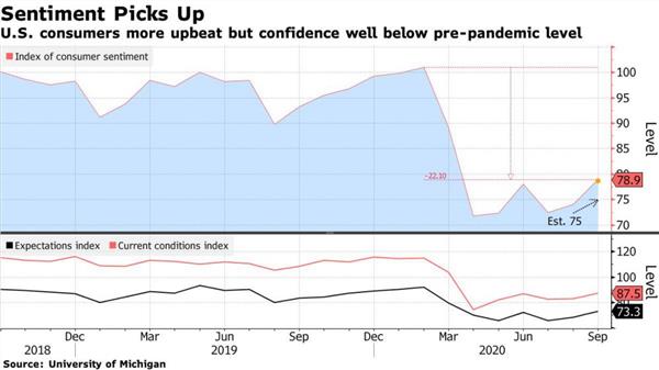 9月18日发布的密歇根大学消费者信心指数初值显示,9月指数从8月终值74.1升至78.9,高于市场预期的75,攀升至6个月以来的最高点。尽管数据显示消费者信心逐渐回升,但仍远低于疫情暴发前的水平。
