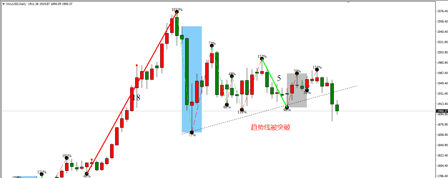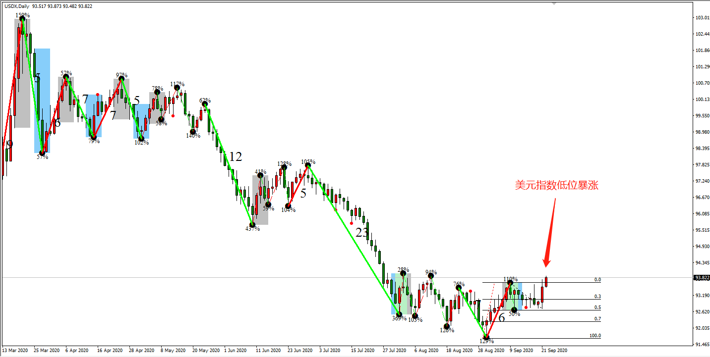 美元指数从三月份开始,已经经历了三次大规模驱动性下跌波段,八月份开始震荡整理,到目前已经持续了将近两个月。按照波浪理论分析,后市将展开三浪的大级别反弹行情。昨日上破9月9日高点93.63,但收盘没能站在阻力上方。观察今日收盘价,如果能够收盘在93.63上方,则有效突破大概率确认。从勾形理论角度分析,9月1日到9日属于勾形左侧趋势性波段,9月9日至21日为勾形右侧调整波段,昨日至今,属于预期之内的上涨。右侧波段回调百分比为30%~50%,属于合理回调。