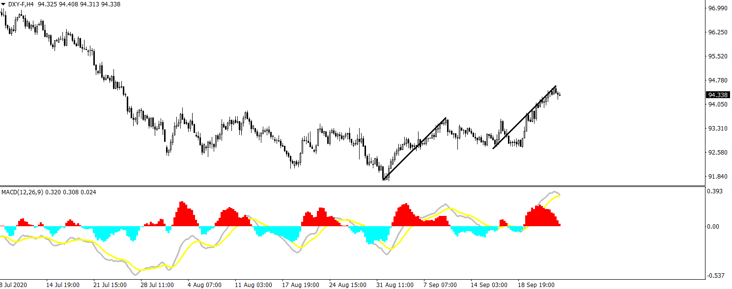 走势图中,美元指数的确破位前期震荡区间,开启上涨势头。但是美元能上涨多久仍是个未知数。从4小时图来看,美元指数或许迎来一轮调整,图中出现了AB=CD的谐波形态,MACD即将形成死叉。