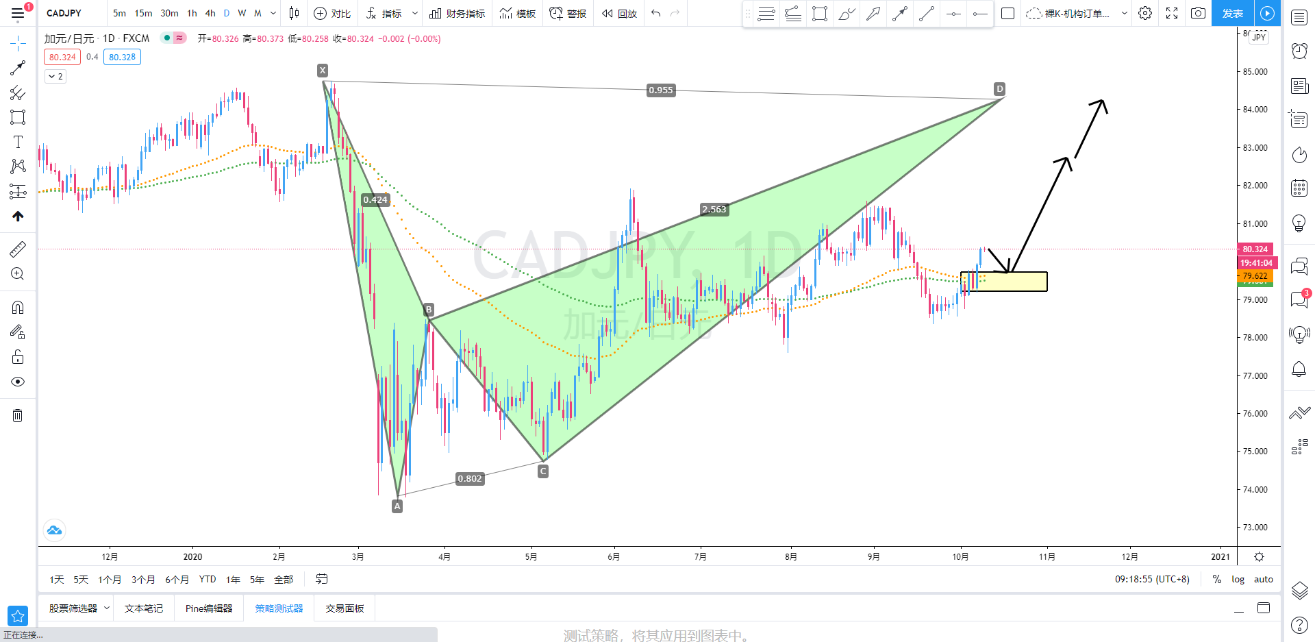 策略解析:加日突破日线均线系统压制出现底部反转后开启上行走势,现在价格已经完全站稳4小时以及日线均线系统上方,并且4小时均线系统已经确认多头排列,后市继续开涨加日。后市关注价格能否回踩日线需求区79.70-79.20,择机逢低买入加日,目标依次上看82.70、84.20,以期后市价格能够完成日线级别潜在蝙蝠模式。