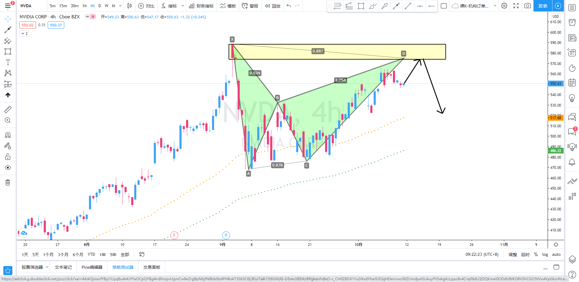 策略解析:英伟达4小时周期级别即将完成看跌蝙蝠模式,并且和上方的供给区出现重叠阻力,因此后市需要密切关注575-589区域会否出现价格滞涨的迹象或者是K线的一系列反转形态,可在出现后择机逢高做空英伟达,有效止损590的上方,下看第一目标先至525一线附近。