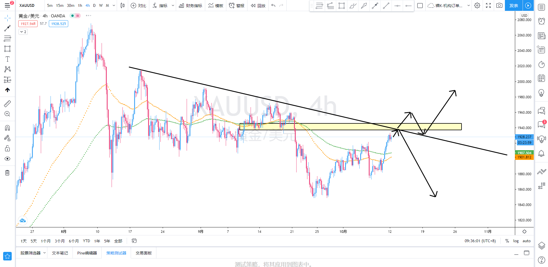 策略解析:黄金反弹继续,但是价格将会来到下降趋势线的压制,并且也是周线大型供给区的重合位置,因此,短期内黄金已经不适合再去继续追涨,后市需要关注1937-1946区域的得失情况。如果价格有效上破趋势线,可在后续再次回踩确认的时候,择机逢低买入黄金,或将会有一波不错的上行走势;但是如果价格在趋势线和供给区的重合压制位置,继续出现滞涨或者反K信号,那么依然以逢高做空为主,并且将会大概率奠定黄金在大周期上的顶部形态。