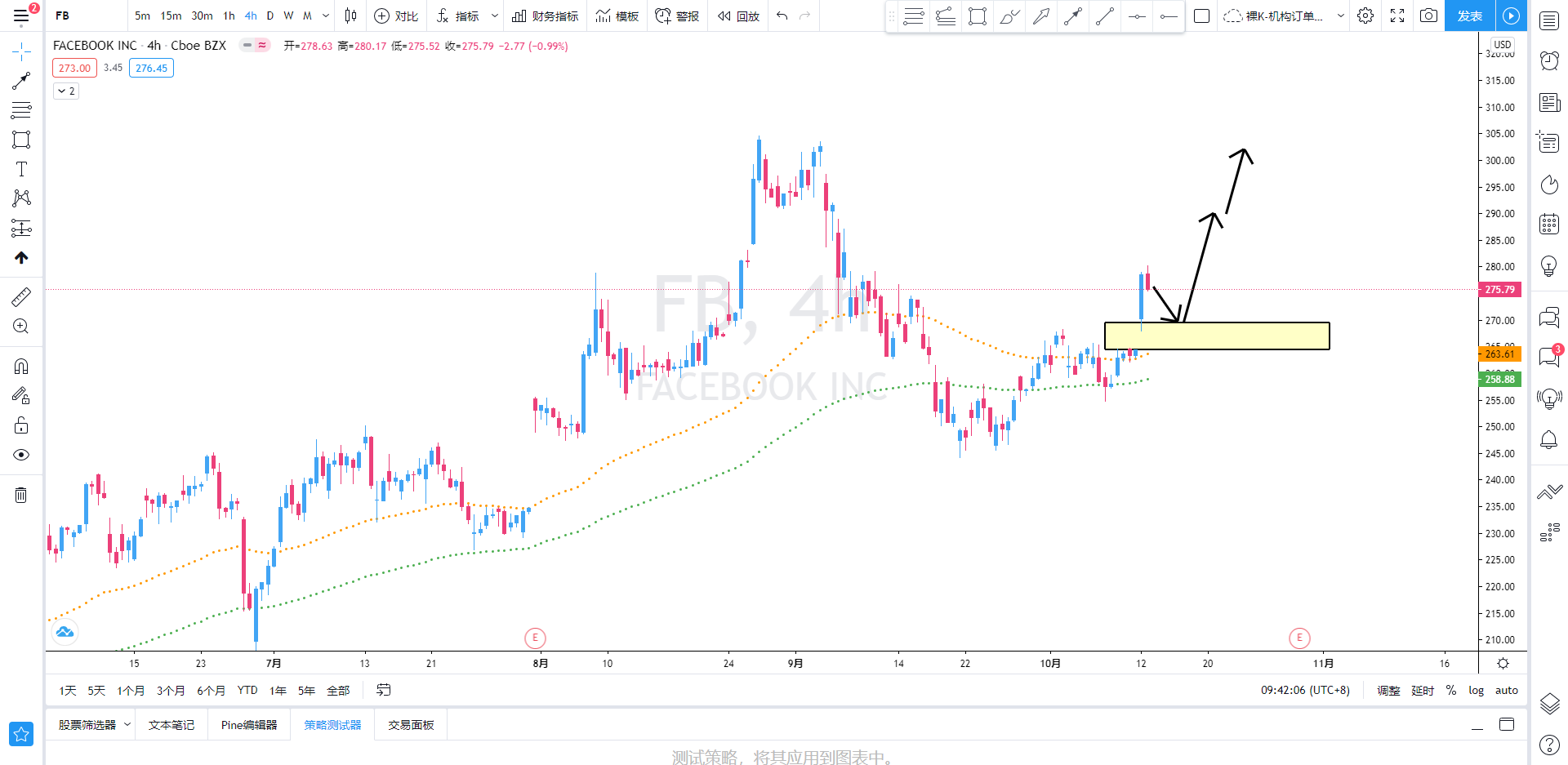 策略解析:FACEBOOK的4小时周期依据均线系统的支撑,仍然是继续积极看涨为主,隔夜的大阳线也奠定了后市上行的基础,彻底宣告之前一段时间的修正调整。之后关注价格能否回踩下方需求区270-265,可择机逢低买入FACEBOOK,上看目标290、301。