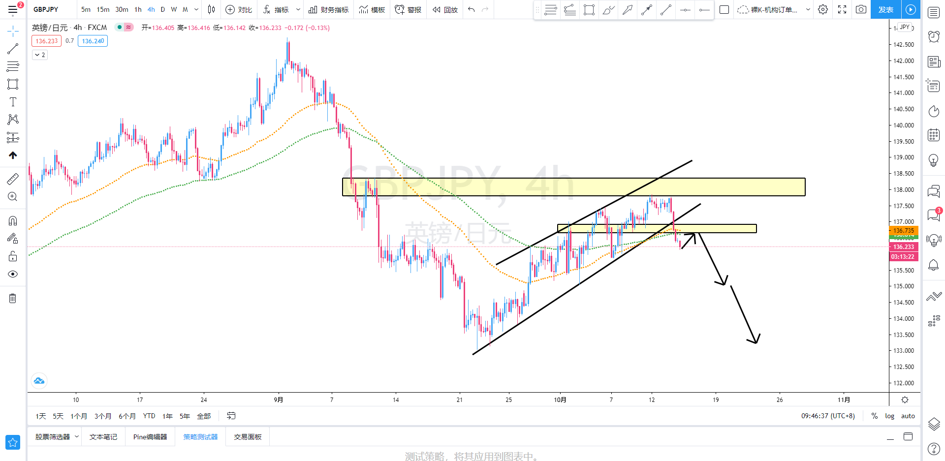 策略解析:镑日之前沿着上行通道震荡上行,最终在4小时级别供给区受到压制,隔夜价格强势跌破上行通道后也预示着镑日的反弹接近结束,后市或将迎来第三浪的主跌行情。日内关注价格能否回抽136.60-137区域,可择机逢高做空镑日,可先依次下看目标135、133一线附近。