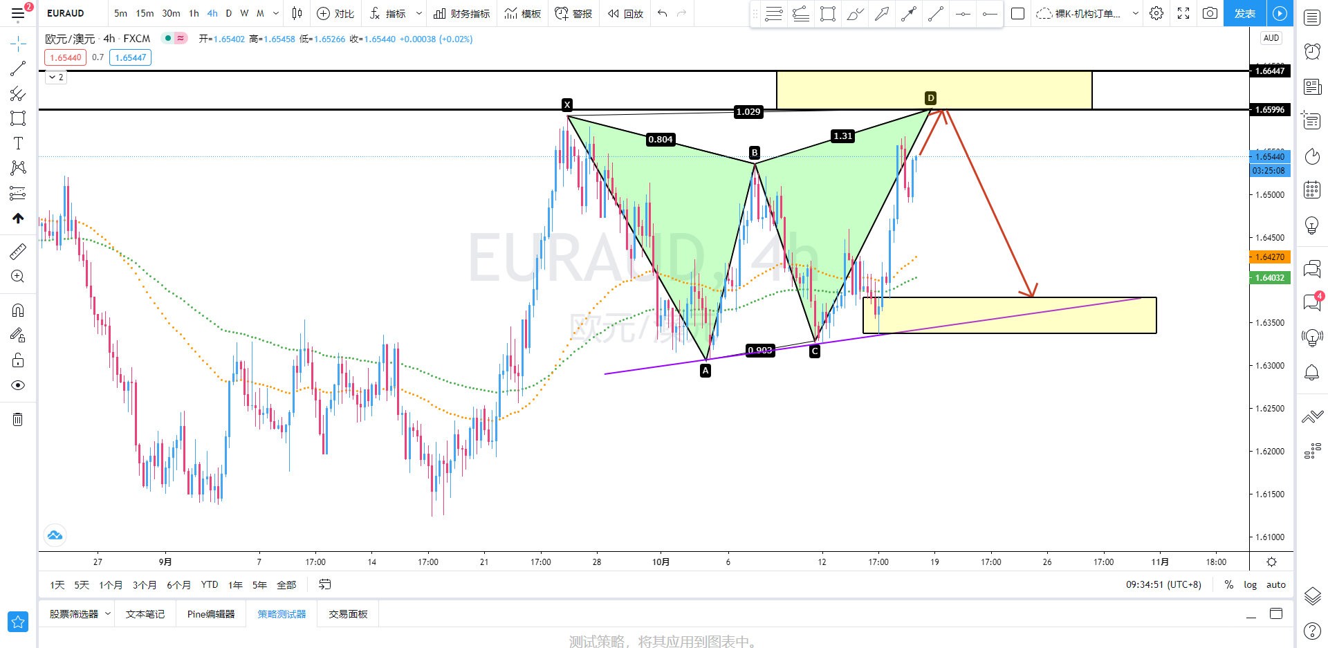 策略解析:欧澳4小时蝴蝶模式即将完成,完成区域或将出现在1.6600-1.6645,并且这个区间不仅仅是蝴蝶模式的完成点位,也是上方日线级别供给区的压制位置,因此,等待价格到位后可以博弈一波下跌回调的走势。如果稳健者,则可等待下方上升趋势线和1.6380-1.6335需求区重合位置,逢低买入欧澳,因为欧澳在月线和周线级别上,已开始慢慢出现大级别筑底迹象,中长线趋势或将反转开启上行。
