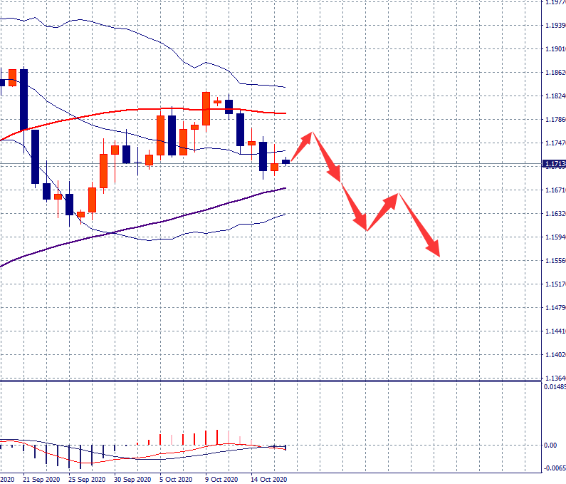 欧元周线图,以中阴线收盘,欧元转入下跌节奏,跌幅超过100点,市场空头力量释放,重回1.1800关口下方,但1.1700支撑较强,短期内有望形成震荡,欧元有望测试1.1800附近压力,但强势突破的概率不高。日线级别布林带缩口,中轨压力在1.1750附近,MACD指标,下跌动能增加,顶背离形态应验,整体看,欧元本周依然倾向于反弹后继续下跌,关注1.1750压力和1.1700支撑,操作上保持高抛低吸的思路。