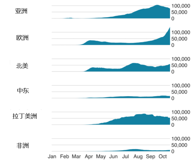 根据上图统计数据图来看,中东及非洲看上去似乎并非十分严重,但实际上由于医疗条件受限,导致无法对目前这两个地区疫情情况做出有效判断。同时目前欧洲病例依旧处于上升阶段。