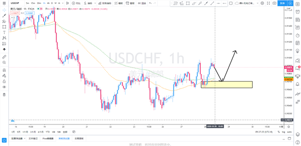 策略解析:美瑞小时级别价格有效站稳均线系统,后市或将朝着上行趋势发展。在大型双底的加持下,日内关注美瑞对于下方需求区0.9070-0.9060再次的回踩确认,并且此区域也是均线系统的支撑位置,若价格再次回归,可择机逢低买入美瑞,有效止损0.9060的下方,短期上看目标0.9100一线附近。