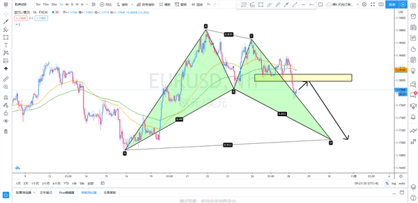 策略解析:欧元小时级别价格跌破颈线位置,双顶形态形成,并且均线系统开始呈现空头排列格局,因此,欧元后市或将开始启动一波下跌行情。日内关注价格回抽重要结构1.1800-1.1810区域的机会,可择机逢高做空欧元,有效止损1.1840的上方,目标关注图中小时级别潜在蝙蝠模式的完成点位D点,即1.1700一线附近。
