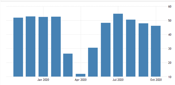 不难看出,上述措施会极大削弱服务业的复苏,再度回到嗷嗷待哺的状态;另一方面,消费的带动作用也会大大降低,工业产品可能面临滞销。经济数据上直接体现在欧元区服务业PMI呈现连续下跌趋势,破近40关口。