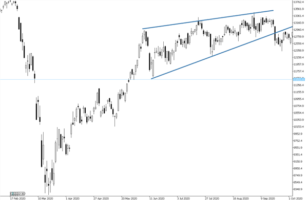 欧洲具有代表性的德国DAX30指数与美国纳斯达克指数就呈现较为显著的差异性。DAX30指数并未完全回补2-3月疫情之间的跌幅;在第三季度形成楔形结构,缓慢上涨。这背后体现了欧美股市驱动力的差异,欧洲主要靠的是欧盟复苏基金的预期,而美国则是靠“希望”中的财政刺激法案,才有了8月之后的进一步上涨。