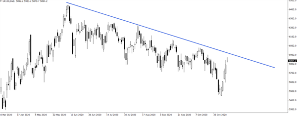 在富时100指数(UK100中)的成分股公司,营业收入超过65%来自海外。如果英镑贬值,以英镑计价的股票价格将会上涨,并且出口吸引力增加,外国投资者购买力上涨。。因此大部分时间内,英镑与富时100指数呈现反向关系。从下图中发现,富时100指数逼近6月以来的下跌趋势线。此种状况下倘若日线图形成长上影线的状况或是较好的介入机会。
