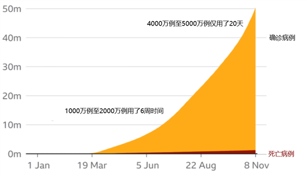 过去几个月,世界上几个地区的冠状病毒病例有所上升,感染率仍然很高。最新数据显示,24小时内报告的病例超过50万例,全球确诊病例上涨速度越来越快,累计确诊病例超过5000万例。最初1000万至2000万例用了6周时间,而4000万例至5000万例仅用了20天。