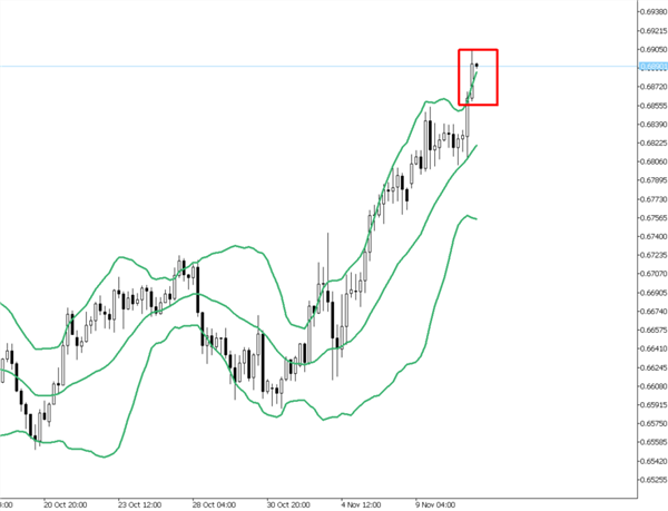 从技术图表上,NZD/USD在短期内向上的势头非常强劲。1小时图中NZD/USD甚至突破了2标准差布尔带的上轨,出现了短期超涨的态势。未来预期大概率将回落至上轨之内,可以留意中轨附近的位置,例如0.6821。