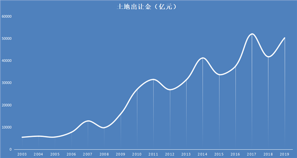 回顾过去17年的土地拍卖市场,全国300个大中城市的土地出让金额,在2003年为5421亿元,至2007年突破一万亿大关,2010年突破两万亿大关,2011年突破三万亿大关,2014年突破四万亿大关,2017年突破五万亿大关。2019年的最新数据显示 ,全国大中城市的土地出让金额达到了50294亿元,创出历史新高。