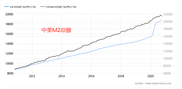 2020年离岸人民币大幅升值,汇率从最高点7.1962一路滑落至6.5474,下跌6488标准点,跌幅5.64%,振幅9.33% 。如此巨大的升值幅度,让那些认为人民币长周期贬值的人统统闭上了嘴。曾经笔者也认为中国的经济基本面决定了人民币贬值的大趋势,因为中国的M2增速在2020年之前远高于美国的M2增速,这也意味着中国流通中的货币扩张的更快,人民币贬值是符合基本面的判断。然而,进入2020年,新冠肺炎疫情不期而至,中国对疫情的防控有目共睹,基本没有对经济造成长周期的拖累。美国的局面却完全不同,数千万人感染,数十万人死亡,新冠对美国经济造成了沉重的打击。为了防止美国境内的企业初夏资金链断裂问题,美联储不惜一切的开动印钞机,不断降低基准利率,肆无忌惮的在公开市场购买债券。美国的M2增速也因此飙升至24.2%,同期中国的M2增速仅为10.5%,如此大的扩张规模,注定了美元指数在2020年出现贬值走势。美元贬值就意味着非美货币升值,人民币也是受益方。