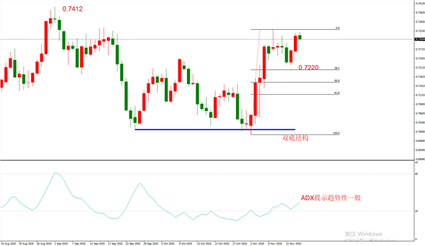 日线级别AUDUSD走势处于上行波段,前期存在双底结构支撑,预计多头持续。上方阻力位0.7412,市价0.7310,空间102点;下方支撑位0.7220,空间90点;盈亏比较为合适。需要提醒的是,最新勾形结构的右侧回撤尚未达到0.382最低分位要求,未来出现高位震荡或补跌行情的概率较高。