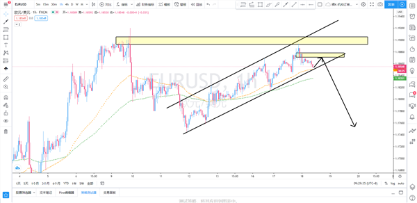 策略解析:欧元价格现在已经上行至小时级别供给区,并且在触及上方供给区后出现迅速回落,欧元在大级别中本身就处于高位,现在的区域位置就显得尤为重要,上行走势或将告一段落,出现反转下跌行情。日内关注左侧交易机会,等待价格回抽1.1870一线附近择机逢高做空欧元,或者是等待价格下破上行通道后直接介入欧元空头,有效止损1.1920上方,下看第一目标1.1750一线附近。