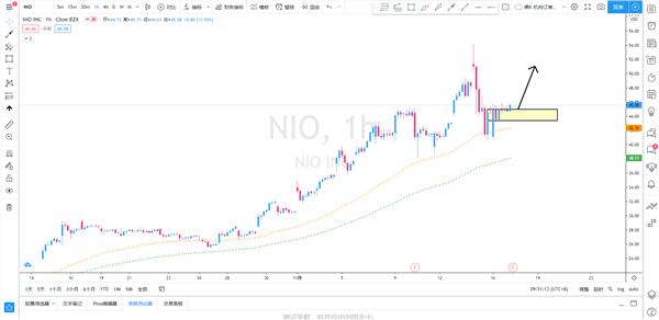 策略解析:蔚来小时级别上涨形态完好,之前一波回调或已将告一段落,后市依然继续看涨。小时级别价格已经受到均线系统支撑后,出现企稳走势,并且已将最近的供给区转换为需求区,因此,日内可择机等待价格回踩至45一线附近逢低买入蔚来,短线可上看目标51一线附近。