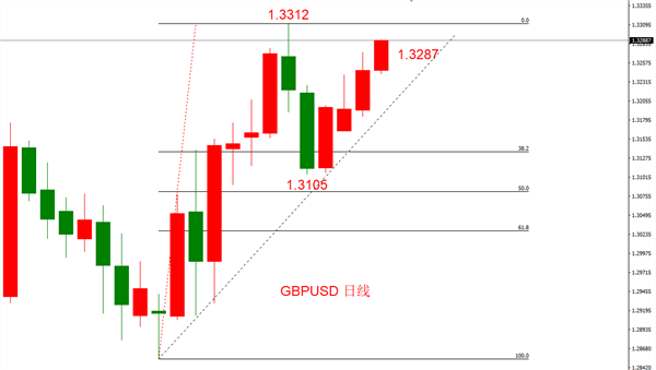 英镑日线级别多头回撤勾形稳固,右侧回撤波段已经结束,最低跌至1.3105,该位置处于0.382~0.5之间,目前已经成为多头支撑位。市价1.3287,距离支撑位空间182点;上方阻力位1.3312,空间25点,做多盈亏比为0.137,较低,但胜率较高,达到87.9% 。综合判断,短线看多,上破前高的可能性很大,密切关注突破高点后是否出现走势纠结。