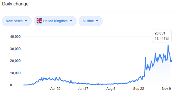 英国单日新增确认人数为20051人,处于较高水平,疫情远未达到拐点。欧洲和美国想要根除新冠疫情,目前来看只能依靠疫苗的大规模普及。英国累计确认人数为141万人,累计死亡52745人,死亡率3.74% 。目前,英国政府已在英格兰地区实施大范围“禁足”措施,在11月5日至12月2日期间,除上学、购买生活必需品、看病等特定原因外,民众被要求尽可能留在家中。与此同时,英国政府从11月6日开始在疫情较重的利物浦市开展全城范围新冠病毒检测。当地或在那里工作的人无论是否出现症状,都可以接受检测。