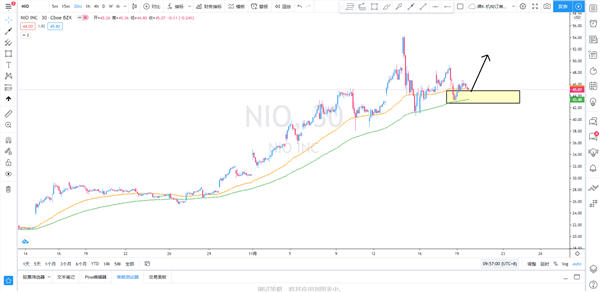 策略解析:蔚来小时级别上涨形态完好,之前一波回调或已将告一段落,后市依然继续看涨。小时级别价格已经受到均线系统支撑后,出现企稳走势,并且已将最近的供给区转换为需求区,因此,日内可择机直接在45一线附近逢低买入蔚来,短线可上看目标51一线附近。