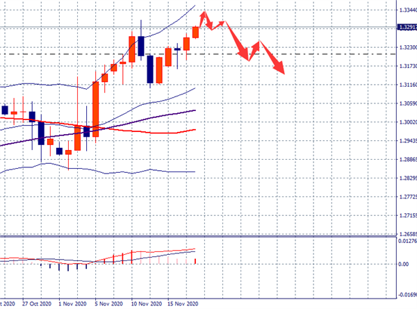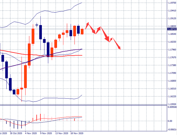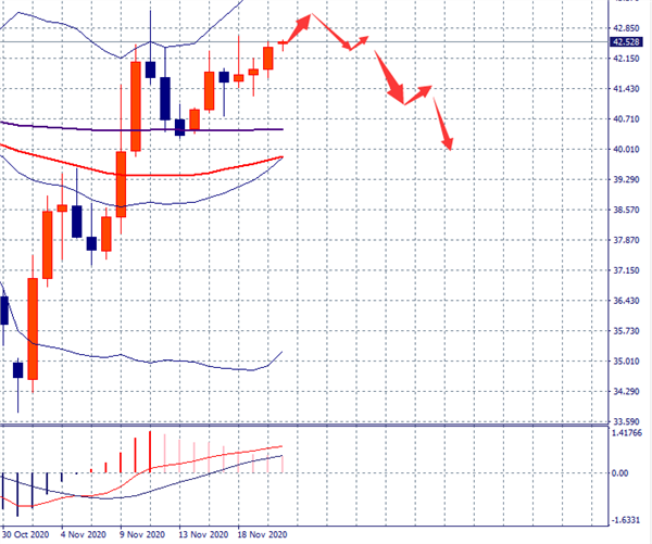 原油受到欧佩克+延迟增产和新冠疫苗有效的双重提振下继续走高,但原油43美元压力较大,短期内难以形成有效突破。本周原油有望在确定压力后开启下跌模式,加上感恩节因素,市场获利盘出场有望形成空头强势力度。而EIA数据一旦再度增加,将有望成为空头爆发的导火索。欧元和英镑上周表现均比较出色,但整体涨幅不大,市场多头难以形成规模性上涨。而脱欧谈判前景依然不明,欧美疫情目前还没有缓解的迹象,加上感恩节因素,欧元和英镑本周都有望形成下跌格局。