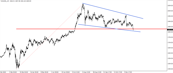 黄金在美国大选之后,并没有因特朗普的耍赖式留任而受到追捧。在11月4日大选落幕之后,至今黄金下跌了90美金,其中还受到两则新冠疫苗临床试验的当头棒喝。在昨晚美国Markit PMI数据公布之后快速下行30美金,跌破1850的重要支撑位置,打开下方空间。