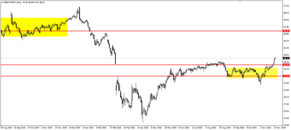 原油前期震荡区间在官宣地板价40美元上方,震幅约为3美元。进入11月以来,原油价格开始大幅攀升,突破前期震荡区间和45美元整数位关口。由于之前布伦特原油的下跌属于非常规事件,从45美元至60美元区间有参考意义的价格并不多,整数位关口可能对后市价格有阻力作用。