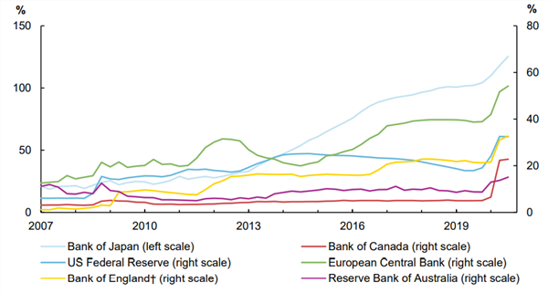 加央行同步采取了量化宽松政策,在二级市场与银行进行交易购买大量债券,包括政府债券,每周购买的计划为50亿加元。值得注意的是,该国QE大规模如果放眼全球,其实并不算激进,才占到GDP的20%左右;与日本央行这类超级放水央行(QE占GDP比例超过100%)仍有明显差距。