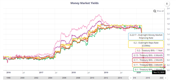 加拿大与美国经济关系密切,同处北美自贸区之中,加拿大央行对于利率的变动经常追随美联储的脚步。今年三月受到疫情冲击以及美国经济衰退的影响,加拿大央行史无前例的一个月降息三次,直接促使货币市场短期收益率急剧下降至0.2%左右。