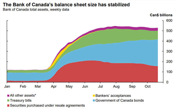 进入7月份之后,加央行开始放缓购债速度,每周购买计划下降20%至40亿加元。从下图可以看出,加央行反而抛售保险证券类资产;大幅度减少国库券的购买速度。停止抵押贷款和银行承兑汇票的购买。8月之后,加央行资产负债表不升反降!