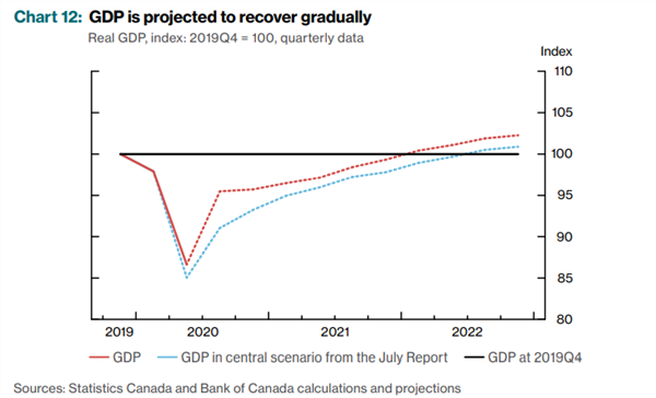 在疫苗实验消息还未公布前,加央行在10月的会议中对于经济的预期就已经上调。预期在2021年中旬恢复到疫情之前的水平,相比年中的预测提前了半年。