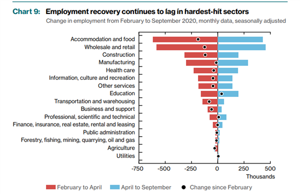 略有隐忧的是劳动力市场的复苏不均衡,受疫情影响严重的部门(住宿业,食品业,旅游业,娱乐业)的失业率依旧高企,目前加拿大采用失业补贴进行救助。但是疫情无法控制的背景之下,很难见到旅游业和电影院等复苏。