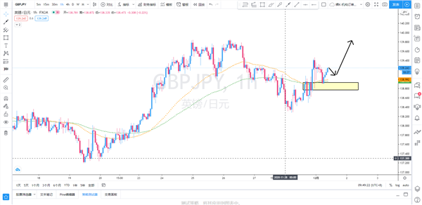 策略解析:镑日小时级别小双底形态确认,并且价格已经重回均线系统上方,也已再次回踩需求区进行确认,后市或将继续上行。日内关注价格再次回踩139.15-139.00区域的机会,可择机逢低买入镑日,有效止损138.90的下方,小时级别上看第一目标139.80一线附近。
