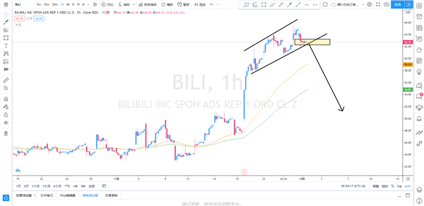 策略解析:哔哩哔哩小时级别高位出现上升震荡形态,大概率表明价格上行已经出现乏力,有回调修正的需求,因此,不宜再去追多追高,而是左侧博弈高空机会,性价比将会更合适一些。日内关注62.20一线跌破的机会,择机顺势介入哔哩哔哩的空头,下看目标51一线附近。