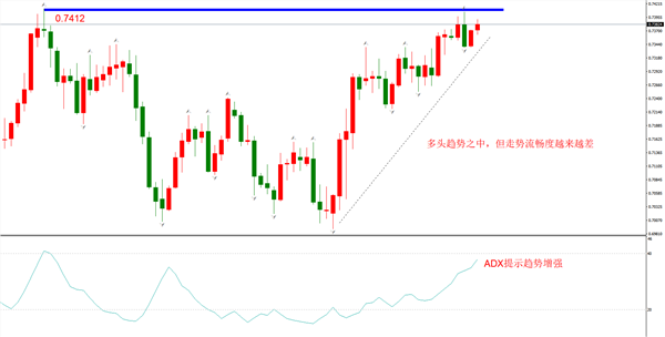 技术分析来看,ADX指标值37.90,处于较高水平,且为上升状态,代表走势流畅度较好,趋势性较强。美元指数已经下破中期支撑位,预计未来空头将延续,这对AUDUSD的多头形成根本性提振作用。