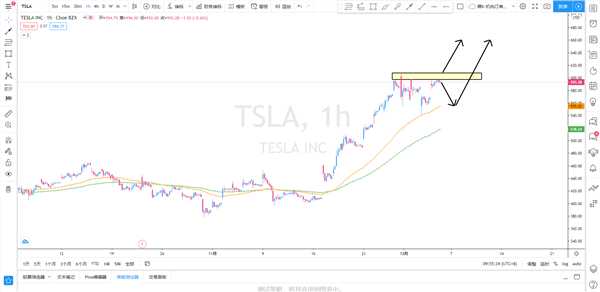 策略解析:特斯拉小时级别多头趋势延续,但是价格来到了前期高点与供给区重合位置,不宜直接追多,耐心观察等待新的交易信号。日内开始密切关注价格对600一线的突破情况,如价格直接突破600可择机直接顺势买入特斯拉;但是价格继续受阻的话,可等待回调至555.50一线附近再去尝试逢低买入特斯拉即可。特斯拉整体呈现上行大趋势,因此,在小级别寻找合适的买入机会是主要思路。
