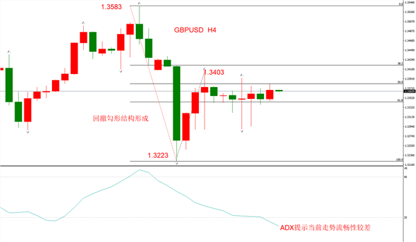GBPUSD四小时级别在昨日形成良好的回撤勾形结构,但在1.3403高点阻力位形成后,并没有出现流畅的下跌走势,反而开启横向震荡。震荡的原因是美元指数反弹波段较为纠结,没有代表性的长阳线出现。大分布参与磅美空头的交易者会将止损位设定在1.3403位置,然而该位置距离市价较近,被打止损的概率较高。不过,从相当长周期来安,磅美最终将走出下跌行情,持单需要耐心。