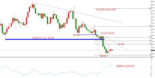 黄金分割角度来看,反弹最大幅度在91.36位置,该价位是黄金分割线与下降趋势线的交叉点。