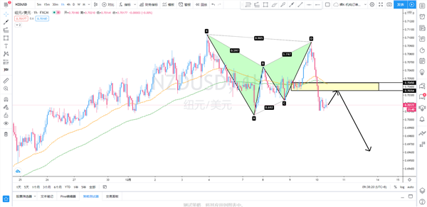 策略解析:纽元日线级别和欧元非常相似,昨天日线也是收出了一根形态较好的看跌Pinbar,并且在小时级别的看跌蝙蝠模式效果也非常好,隔夜出现一波V反的下跌,再次跌穿均线系统,以及造成了均线系统出现死叉的迹象,因此,后市大概率或将继续下跌。日内关注价格能否出现反抽0.7035-0.7045的机会,可择机逢高做空纽元,目标下方可先看向0.6960一线附近。