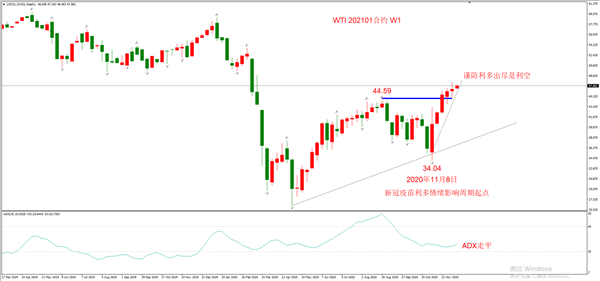 春江水暖鸭先知,如果你在听到全面接种疫苗的消息之后再去买入原油,别说肉吃不到,就连汤都喝不了几口。从周线图来看,原油的最新起涨点在2020年11月8日,距离现在已经有一个多月的时间。支撑这段时间原油上涨的宏观因素,一个是OPEC+的减产会议,另一个就是新冠疫苗即将研制成功的消息。今天,是利多预期兑现的日子,OPEC+决定延长减产到2021年一季度;FDA也批准了新冠疫苗大批量应用。11月份布局多单的聪明人,在这个档口的操作绝不是继续买入,而是止盈平仓,获利了结。卖出去的单子,就留给那些后知后觉的交易者,比如刚刚听到疫苗全民接种的我们。处在消息链条的末端,很难用宏观分析来操作长线交易,这也是为什么彭博社、路透社的金融终端卖的那么贵的原因——消息就是金钱。很多人说,我也可以在11月份预期疫苗将会大规模应用,即便在消息链末端也能提前布局。但是,不确定性的分析和获知内部确定性的消息,两者在下单数量和持有的坚定程度上,完全不同。