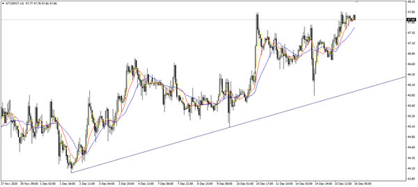 WTISPOT的1小时图中,显示出上涨趋势,价格走势在上涨趋势线上方。5、10和20均线呈现多头排列,未来有进一步上行的可能。在关键整数位50美元关口可能对市场造成影响,出现震荡或回撤的概率较高。后市若能有效突破重要关口,那么走势将进一步明了。