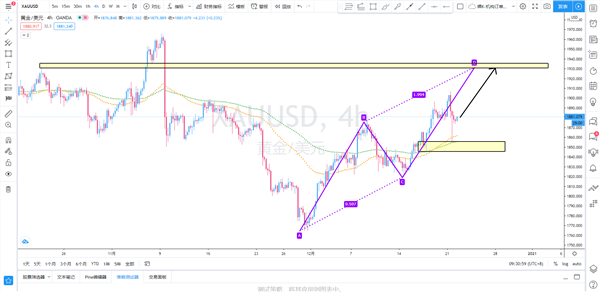 策略解析:黄金上行趋势强劲,一路涨势不减,隔夜闪崩后回踩4小时均线系统支撑后探底回升,均线系统多头排列格局未被破坏,因此,后市或将继续上行,思路仍然以逢低买入为主。日内可直接择机逢低买入黄金,上方目标则可看向潜在AB=CD形态完成点位D点,即1930-1935区域附近。