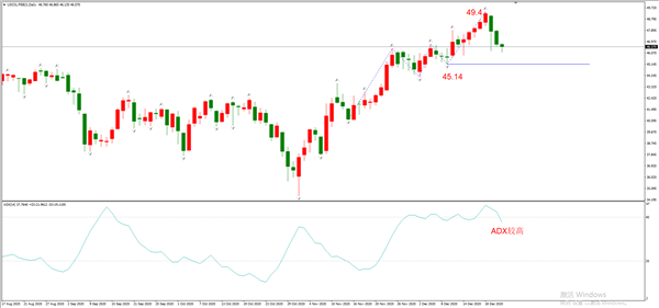 原油的大幅下跌在意料之内,因为前一个上涨波段的走势力度实在是太弱了。但是,当前的下跌最多定义为回调,待寻到支撑位之后,还将进一步上行。最近的支撑位在45.14位置。之所以看多未来油价走势,是因为新冠肺炎疫苗已经在美国和欧洲开启接种,未来原油需求面将获得巨大改善。唯一的风险点在OPEC+的增产,如果在2021年1月份的会议上落实增产,则原油的上涨将变得非常艰难。